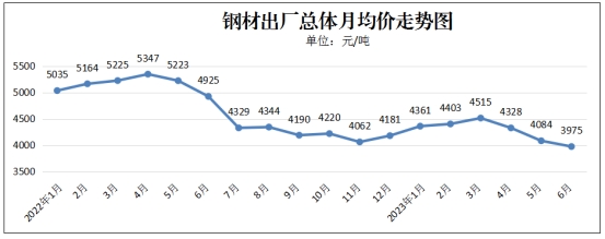 监测的5个品种钢材出厂价(含税)出现全部下跌的行情,每吨总体月均价3975元,环比(与5月份相比)下跌109元,跌幅2.66%。