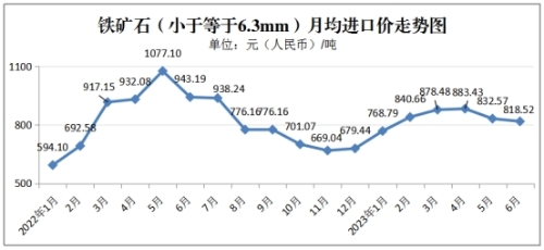 铁矿石进口价格为每吨818.52元,环比下跌14.05元,跌幅1.69%。