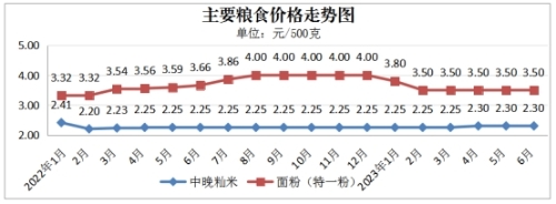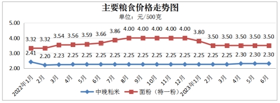 监测的市场成品粮每500克晚籼米2.30元、面粉(特一粉)3.50元。与5月份相比,晚籼米、面粉价格持平。