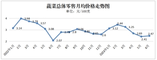 原因分析:由于春季不利的气象条件,导致部分蔬菜供应出现断茬现象,如芹菜、大白菜等蔬菜还在等待后续产地衔接;伴随梅雨季节来临,叶菜类保鲜成本提高,售卖期缩短,价格上涨;叠加端午节节日效应进一步提振市场需求,蔬菜整体价格呈现上升趋势。但我市端午节“惠民菜篮子”持续运行,起到保供稳价效果,抑制蔬菜价格上涨,整体蔬菜价格保持稳定。