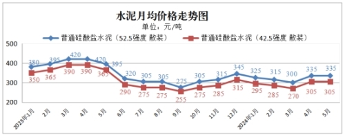 监测的普通硅酸盐水泥每吨52.5级335元、42.5级305元,总体均价320元,环比持平。