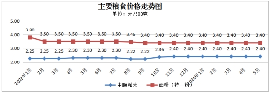 监测的市场成品粮每500克中晚籼米2.40元、面粉(特一粉)3.40元。中晚籼米、面粉(特一粉)价格环比均持平。