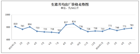 监测的每50公斤三元生猪(出厂价格)均价783元,环比上涨12元,涨幅1.56%。