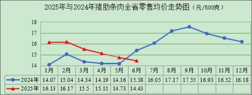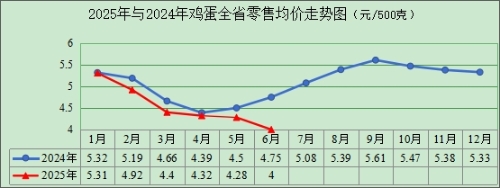 (五)鸡蛋价格持续下降。受2024年下半年行情利好刺激,养殖端补栏积极性高涨,新开产蛋鸡数量激增,鸡蛋市场供应过剩、需求疲软叠加猪肉等替代品价格低位运行,推动蛋价一路下行。据卓创资讯显示,截至今年5月底全国在产蛋鸡存栏量增至13.34亿只,达到近3年最高值。上半年鸡蛋价格累计降幅达24.67%,全省零售均价每500克为4.54元,比去年同期下跌5.42%。