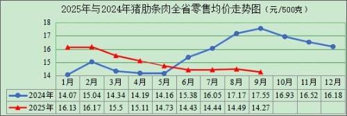 (三)生猪和猪肉价格弱势运行。据监测,三季度全省生猪定点养殖场出栏量环比增加3.68%,生猪市场整体供应宽松,而终端消费处于淡季,因此生猪和猪肉价格呈弱势震荡态势。生猪全省出场均价每50公斤为714元,比上季度、去年同期分别下跌4.63%、28.14%,且自8月第2周起,猪粮比价持续低于6:1。猪肉(精瘦肉、后座统货、肋条肉)全省零售均价每500克分别为15.79元、11.61元、14.4元,比上季度分别下降2.05%、4.21%、2.44%,比去年同期分别下跌13.95%、20.64%、14.89%。