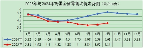 (五)鸡蛋价格低位略有回升。8月下旬以来,受学校开学、食品厂和下游批发商国庆中秋备货等因素影响,市场需求增加推动鸡蛋价格略有回升,但由于蛋鸡存栏量处于历史高位,市场供应充足,鸡蛋价格仍明显低于去年同期水平。鸡蛋全省零售均价每500克为3.97元,比上季度、去年同期分别下跌5.48%、25.93%。