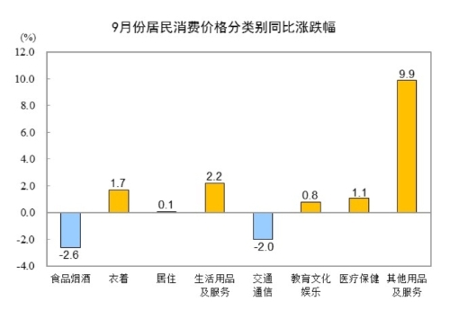 9月份,全国居民消费价格环比上涨0.1%。其中,城市持平,农村上涨0.2%;食品价格上涨0.7%,非食品价格下降0.1%;消费品价格上涨0.3%,服务价格下降0.3%。