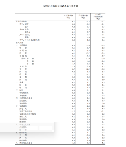 2025年9月份居民消费价格同比下降0.3% 环比上涨0.1%